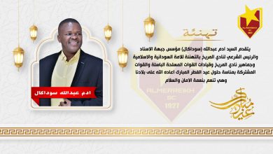 يتقدم السيد آدم عبدالله آدم (سوداكال) مؤسس جبهة الإسناد الوطني والرئيس الشرعي لنادي المريخ بالتهنئة للأمة السودانية والإسلامية وجماهير نادي…