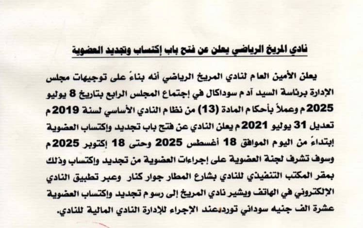 يعلن الأمين العام لنادي المريخ الرياضي أنه بناءً على توجيهات مجلس الإدارة برئاسة السيد آدم سوداكال في إجتماع المجلس الرابع بتاريخ 8 يوليو 2025م وعملاً بأحكام المادة (13) من نظام النادي الأساسي لسنة 2019م تعديل 31 يوليو 2021م يعلن النادي عن فتح باب تجديد وإكتساب العضوية إبتداءً من اليوم الموافق 18 أغسطس 2025 وحتى 18 إكتوبر 2025م وسوف تشرف لجنة العضوية على إجراءات العضوية من تجديد وإكتساب وذلك بمقر المكتب التنفيذي للنادي بشارع المطار جوار كنار وعبر تطبيق النادي الإلكتروني في الهاتف ويشير نادي المريخ إلى ان رسوم تجديد وإكتساب العضوية عشرة الف جنيه سوداني تورد عند الإجراء لإدارة النادي المالية.
